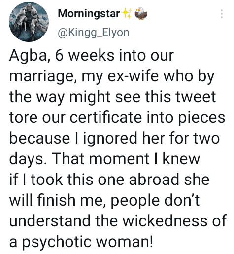 In his tweet, @kingg Elyon expressed his astonishment at his ex-wife’s actions, emphasizing that just six weeks into their marriage, she tore their certificate into pieces because he had ignored her for two days.