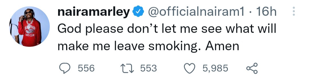 Naira Marley hopes to not expertise something that might make him stop smoking. The singer took to Twitter to say a brief prayer.  God please do not let me see what’s going to make me depart smoking. Amen, he wrote. The put up “God please, don’t let me see what will make me leave smoking,” Naira Marley prays appeared first on Linda Ikeji Blog.