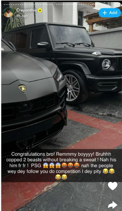 Singer, Crayon has shown off two new cars his colleague Rema bought.  Sharing a photo of the cars on Snapchat, Crayon said Rema bought the cars without breaking a sweat.  He added that he pities those competing with Rema.    The post Singer Crayon shows off two new cars his colleague Rema bought appeared first on Linda Ikeji Blog.